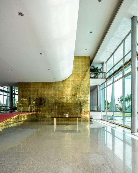 The pure modernist form expressed by Oscar Niemeyer and Paulo Mendes da Rocha, have influenced and continue to influence my work today. Take for example Niemeyer’s gold wall at the Alvorada Palace. There’s a magnitude of gold but in equal value a simplicity that removes it from a position of power and wealth, he displaces gold from an ostensible place. I find this brilliant. I’m also fascinated by science fiction and UFOs, and a lot of Niemeyer’s works, and this specific one by Rocha, make me think of spaceships.