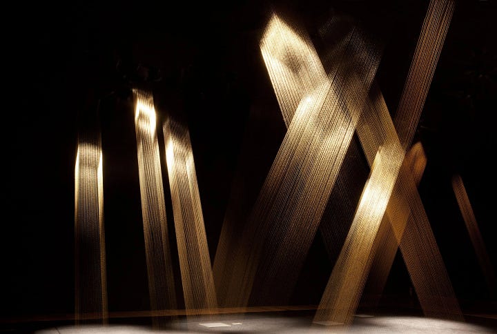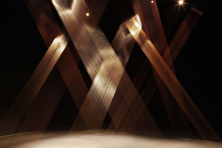 Lygia Pape revisited “Ttéia 1, C” throughout her career in 1976 and 2002. Both the work and the name, which means web in Portuguese, remind me of the wisdom of nature. We, nature, need years to develop, adapt, and integrate into an ecosystem. When spiders are building webs, they use their legs to feel the environment’s frequency and assess if it has the necessary conditions for that web. If they feel the wrong conditions, they will eat the web and move onto a new place. I think this is a beautiful metaphor for how we interact with life and make decisions.
