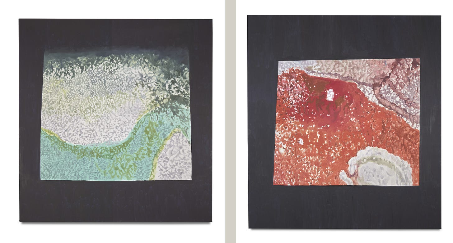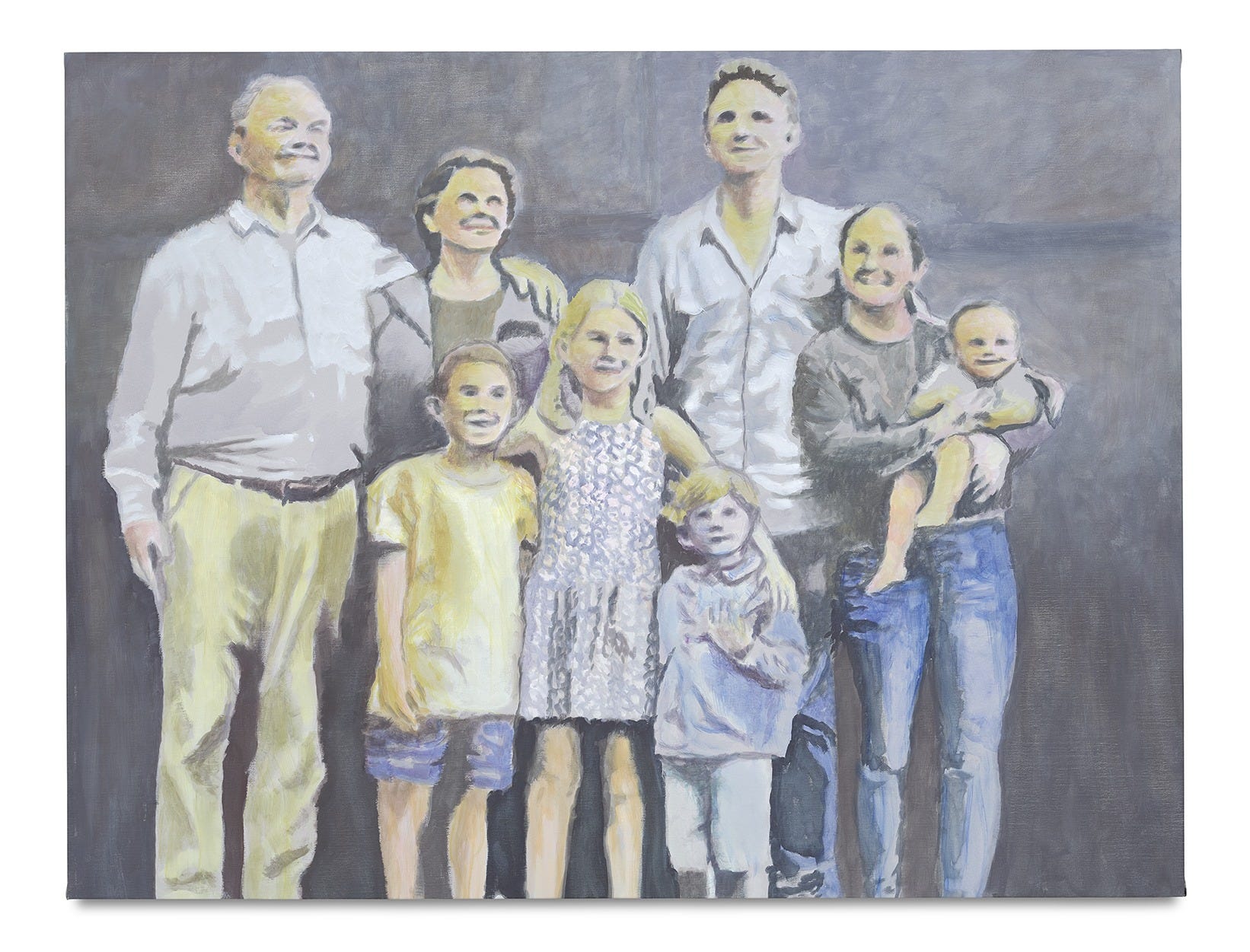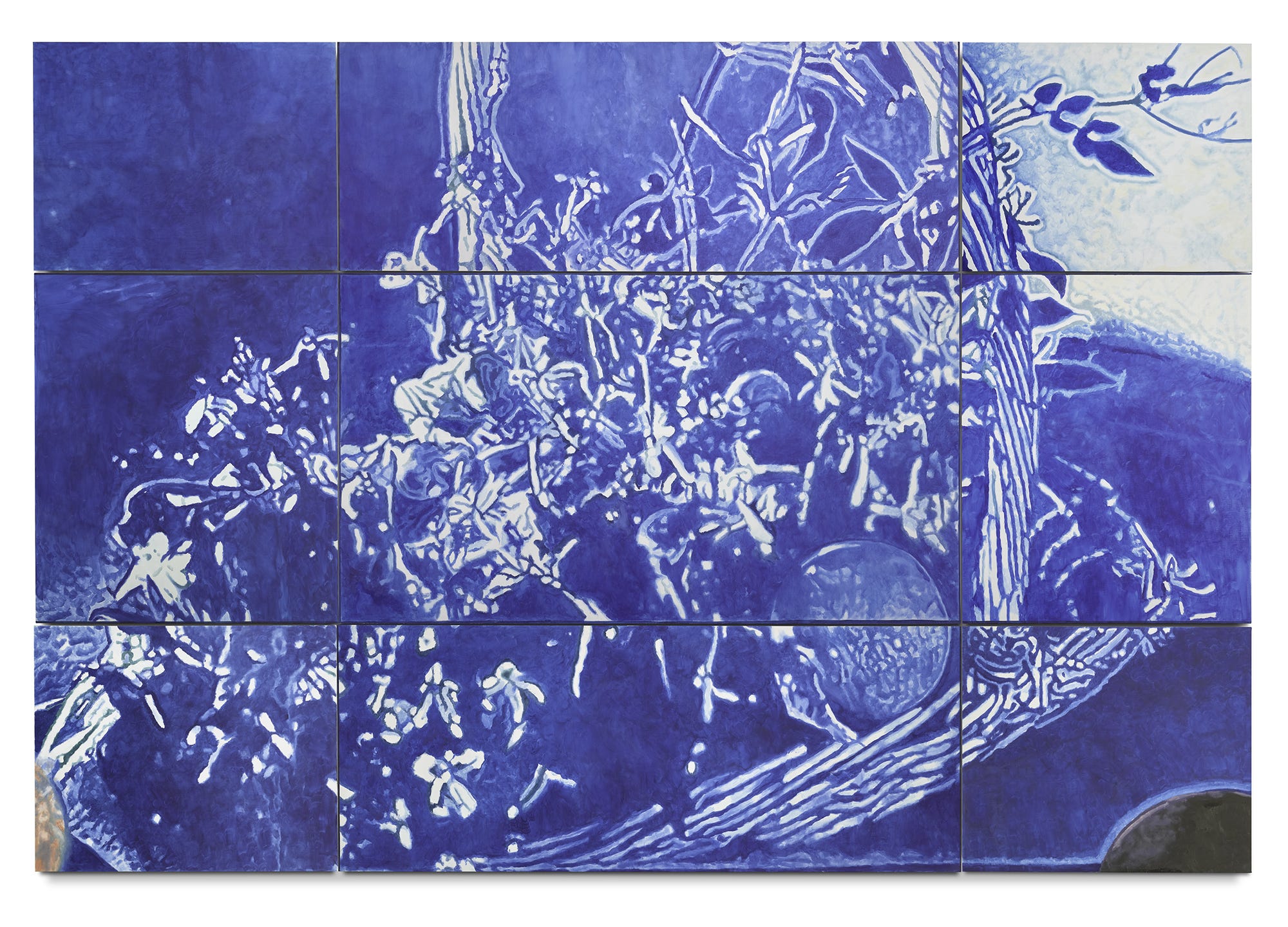 They will encounter The Fruit Basket, the largest painting on view that lends its name to the exhibition. No matter where one stands, it will be impossible to avoid the five-by-sixteen-meter blue image fragmented into a nine-canvas grid and hanging as one piece. As one makes their way closer to the painting, they’ll notice it was once an iPhone picture of a fruit basket—we can see the artist’s thumbs on the bottom edges of the work. When one is but steps away from the painting, their proximity will start to impair their perception and the fruit basket will disintegrate into purposeful brush strokes.