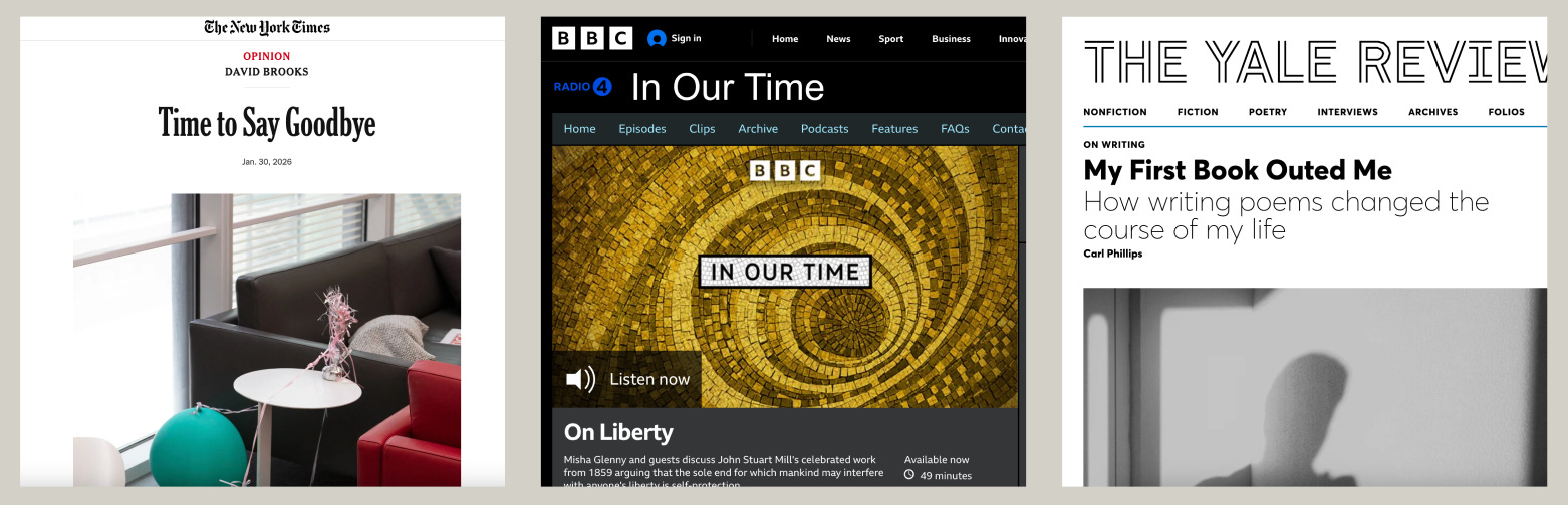 Plus BBC's In Our Time is back on the air, David Brooks wrote his final column for the NYT, and Carl Phillips' essay in the Yale Review.